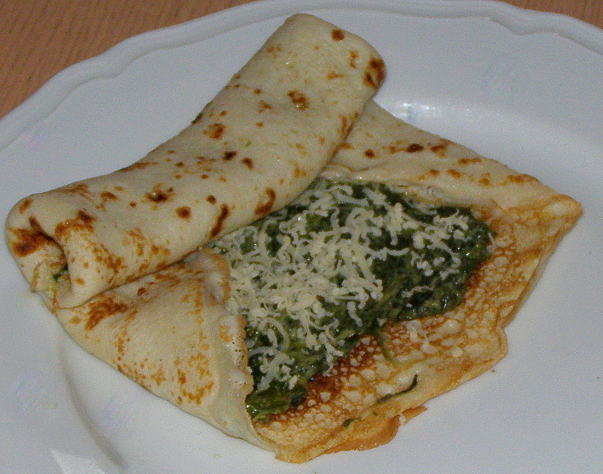 Na usmażonych naleśnikach rozsmarować szpinak (taką ilość, jaką lubimy). Po wierzchu można posypać utartym żółtym serem, jeśli ktoś lubi więcej sera. Naleśnik zwinąć w rulonik, w krokiecik lub w trójkąt – jak kto lubi. Obsmażyć na średnim ogniu z obu stron. Smakuje na gorąco i na zimno.