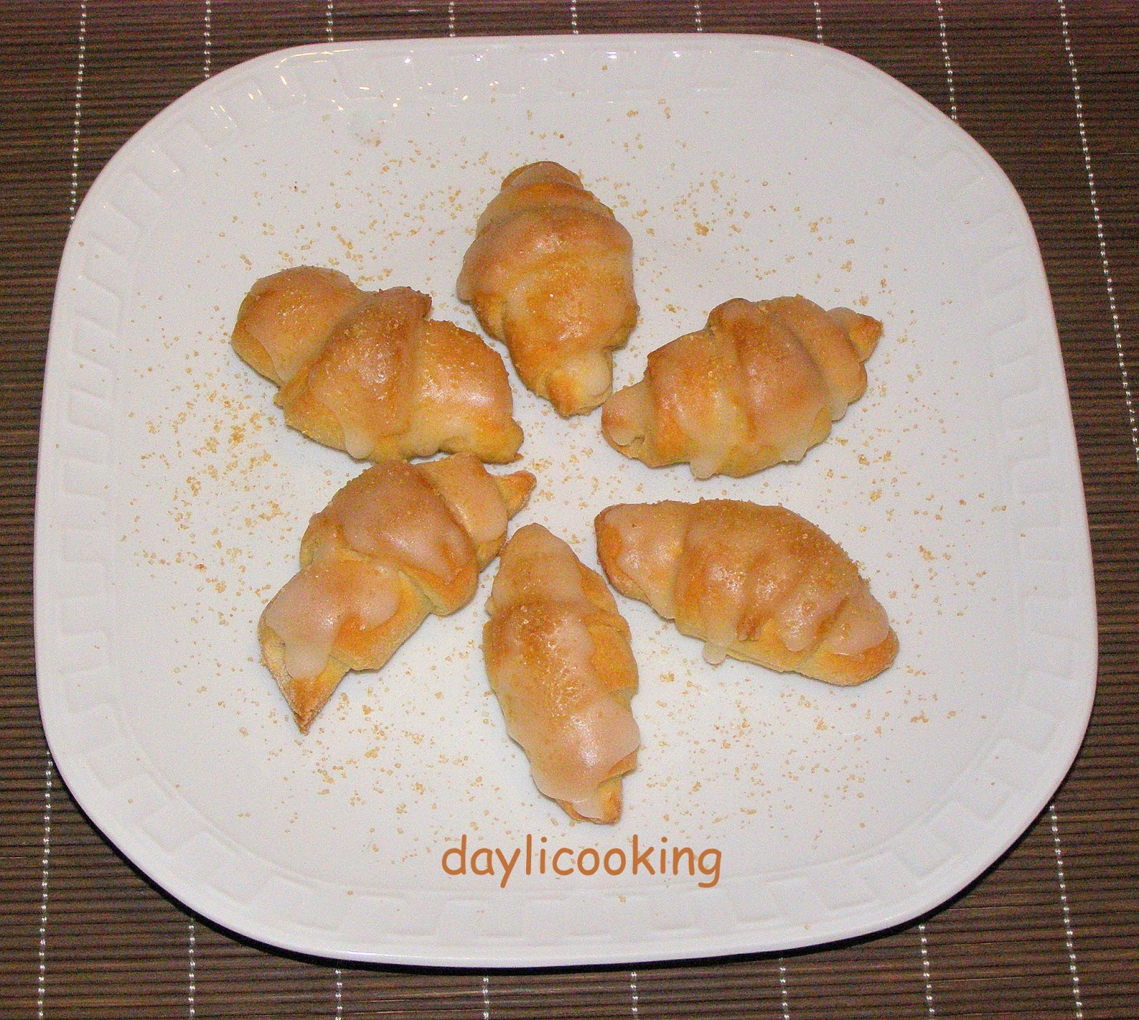 Drożdże utrzeć z łyżką cukru, dodać szklankę ciepłego mleka i 4-5 łyżek mąki. Rozmieszać dokładnie i odstawić do wyrośnięcia. Dodać resztę mleka, przesianą mąkę i sól. Lekko zagnieść. Dodać kawałki masła i przesiekać nożem aż ciasto połączy się. Kiedy będzie już tworzyło w miarę zwartą bryłę, w której będą widoczne drobinki tłuszczu, zagnieść w kulkę. Starać się jak najmniej zagniatać rękami, żeby tłuszcz nie rozpuszczał się pod wpływem ich ciepła. Ciasto odstawić na 10-15 minut w chłodne miejsce. Po tym czasie rozwałkować na grubość około 1 cm., wykrawać trójkąty i zawijać w rogaliki. Do środka można nałożyć owoce (na przykład cząstki jabłka, gruszek czy śliwki) lub odrobinę twardego dżemu. Pieczemy w temperaturze około 200 stopni do lekkiego zrumienienia. Dekorujemy według uznania. Ja przygotowałam mój ulubiony i najprostszy na świecie lukier cytrynowy.