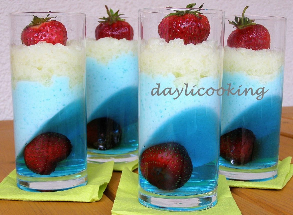 Tak przygotowaną nałożyć do szklanek na stężałą niebieską galaretkę.