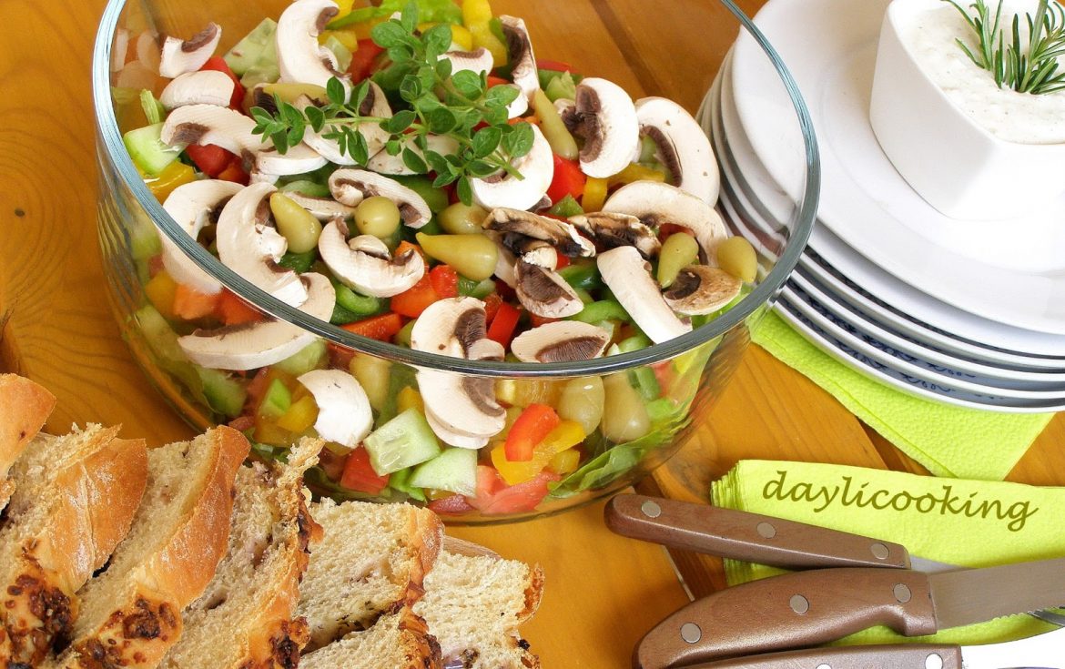 Ta sałatka daje nam olbrzymie możliwości komponowania składników. Możemy przygotować ją niewielkim kosztem z tego, co akurat mamy w lodówce, a latem zawsze są pod ręką podstawowe warzywa, prawda? Wystarczy sałata, ogórek, pomidor i na przykład marchew starta na grubej tarce i już mamy sałatkę. Zaletą jest też to, że można przygotować dużą miskę takich warzyw i przechowywać w lodówce bez obaw, że podejdzie wodą. W sałatce na poniższym zdjęciu znalazły się: sałata, świeży ogórek, papryka zielona, żółta i czerwona, marynowane małe papryczki chili, świeże surowe pieczarki i pomidor.