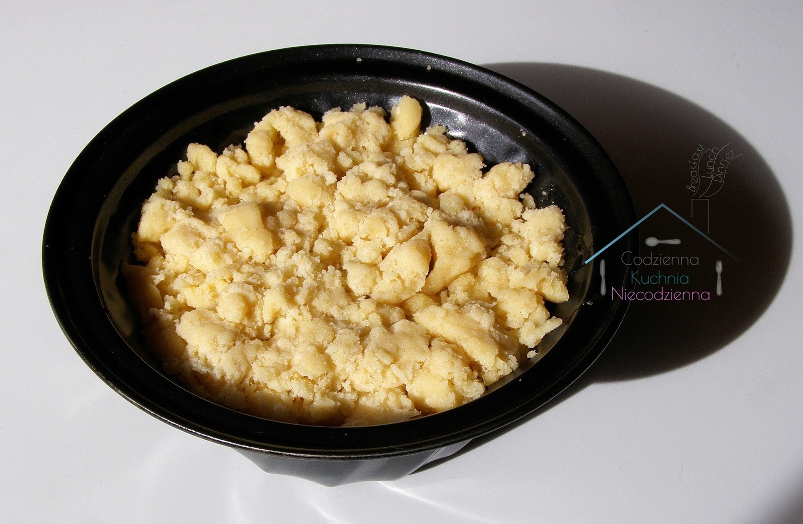 Wszystkie składniki połączyć i zagnieść. Musi powstać jednolite ciasto, podobne do kruszonki. Ciasto odstawić na kilkanaście minut – nie koniecznie do lodówki.