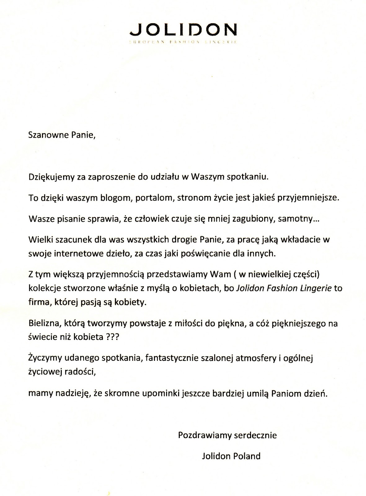 Pani Agnieszka Bielawska z firmy Jolidon dopieściła wręcz nas wszystkie. Każda otrzymała inny komplet bielizny, dopasowany oczywiście rozmiarem. Wszystko było pięknie zapakowane i przewiązane kokardką z karteczką z imieniem. Do prezentów był dołączony ten oto list: