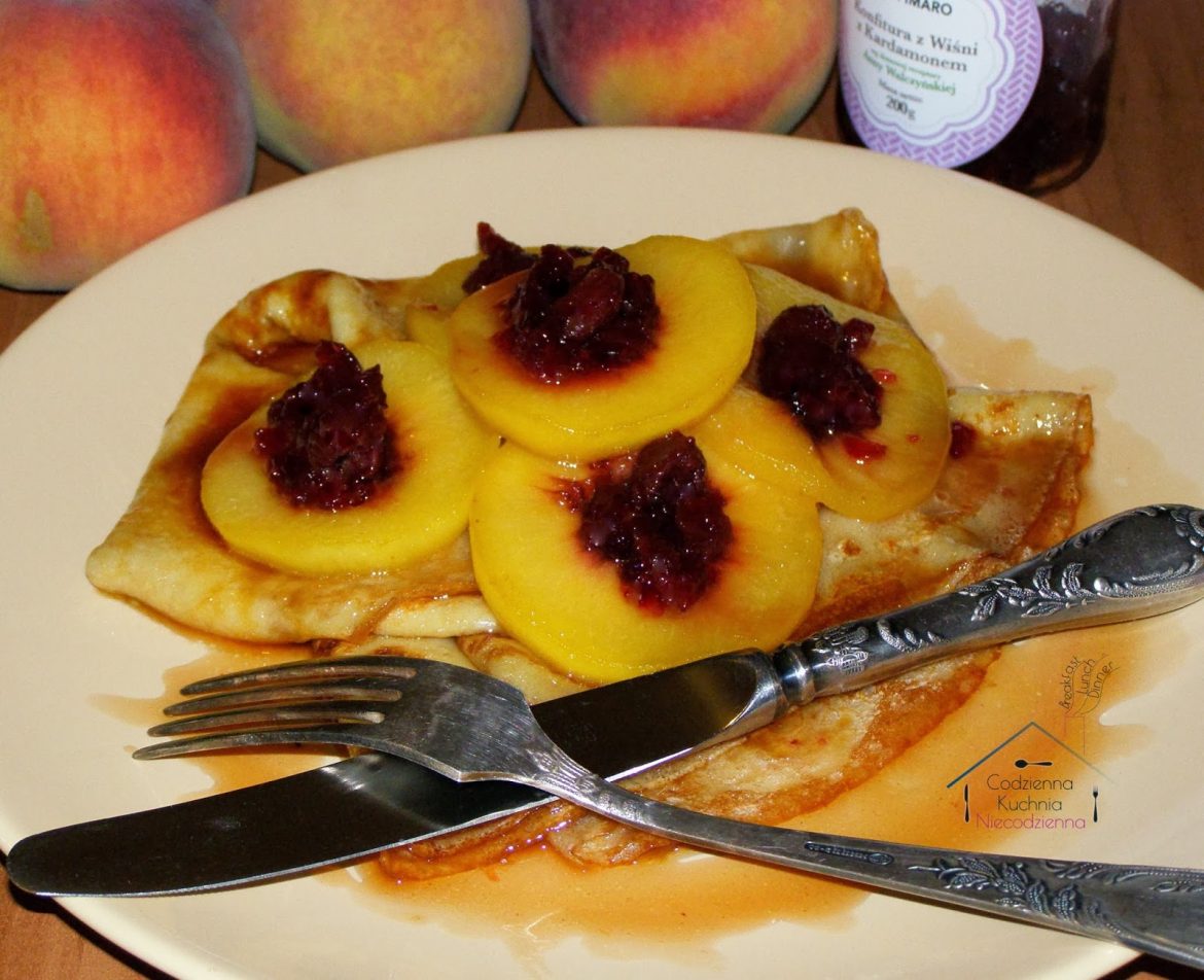Przepis na naleśniki z brzoskwiniami karmelizowanymi z dodatkiem wiśni
