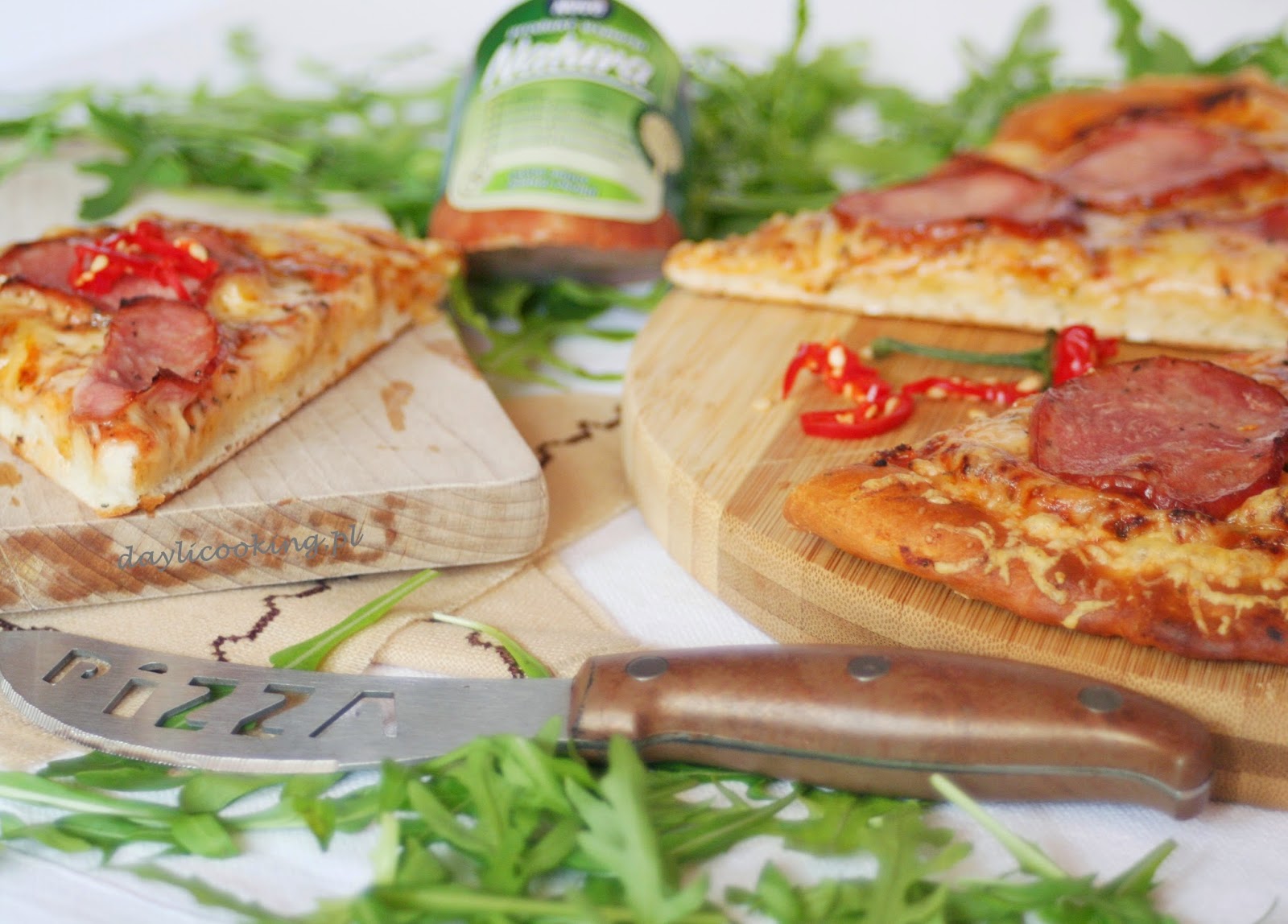 Podoba mi się, że ciasto nie musi wyrastać, i to bardzo! Jak nas znowu najdzie na pizzę to tym razem, wypróbuję ten przepis na ciasto 🙂 Tak swoją drogą, nie znałam patentu na smarowaniem olejem żeby sos nie wsiąkał- toż to genialne jest! Ja często daję na pizzę (a także to tostów, zapiekanek itp.) tatrzańską- też świetnie się sprawdza 🙂 No i bardzo mi się podoba ten Twój nóż do pizzy 🙂