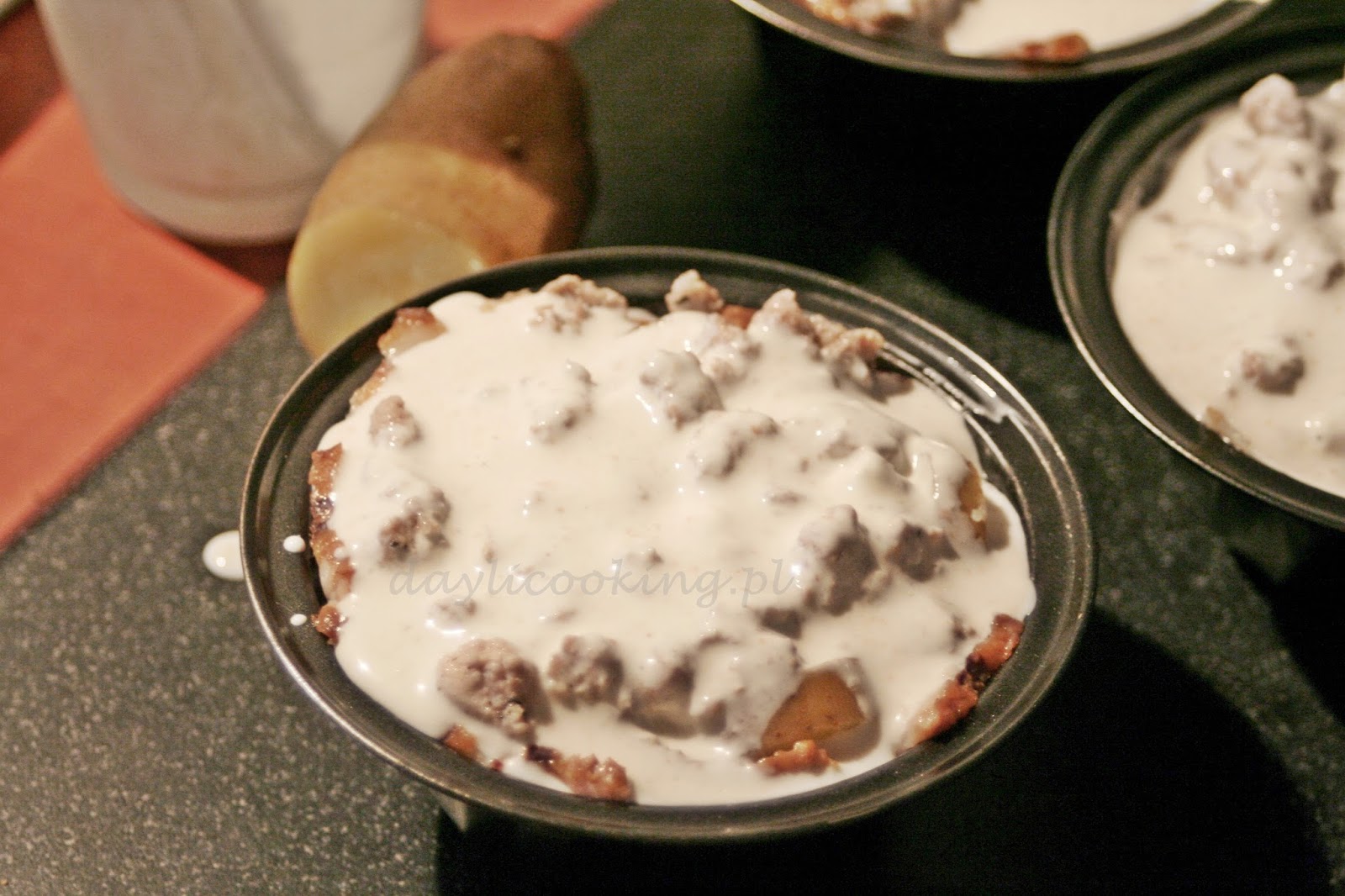 Na boczku w podobny sposób ułożyć plastry ziemniaków, a na nie mięso. Na mięso resztę ziemniaków i przykryć kolejną warstwą mięsa.