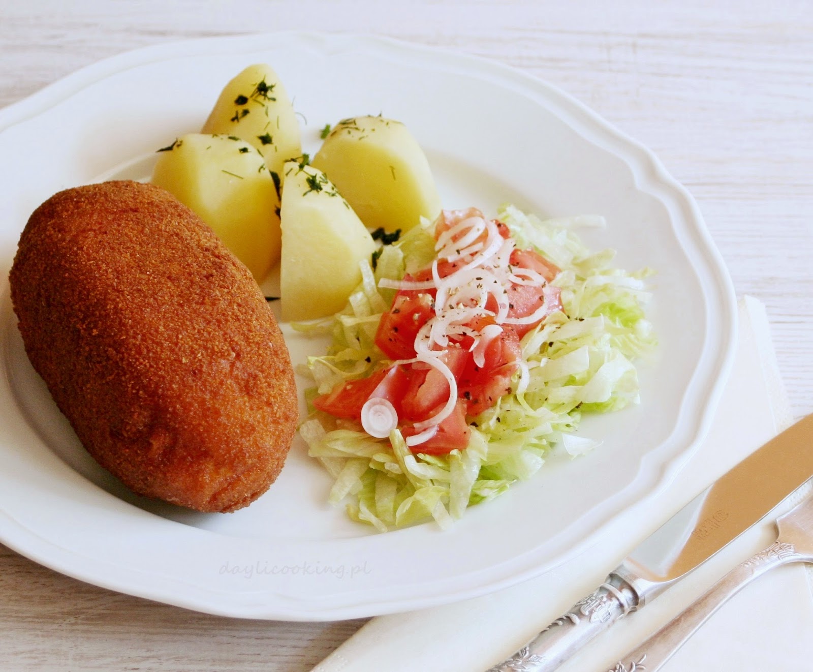 Usmażony kotlet de volaille można podać z ziemniakami w najróżniejszej formie: od gotowanych, przez puree, frytki do kuleczek czy opiekanych.