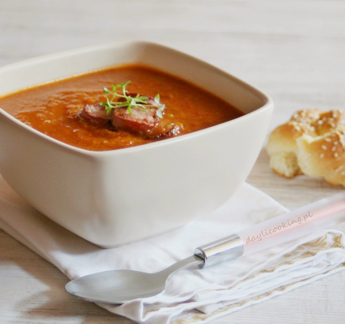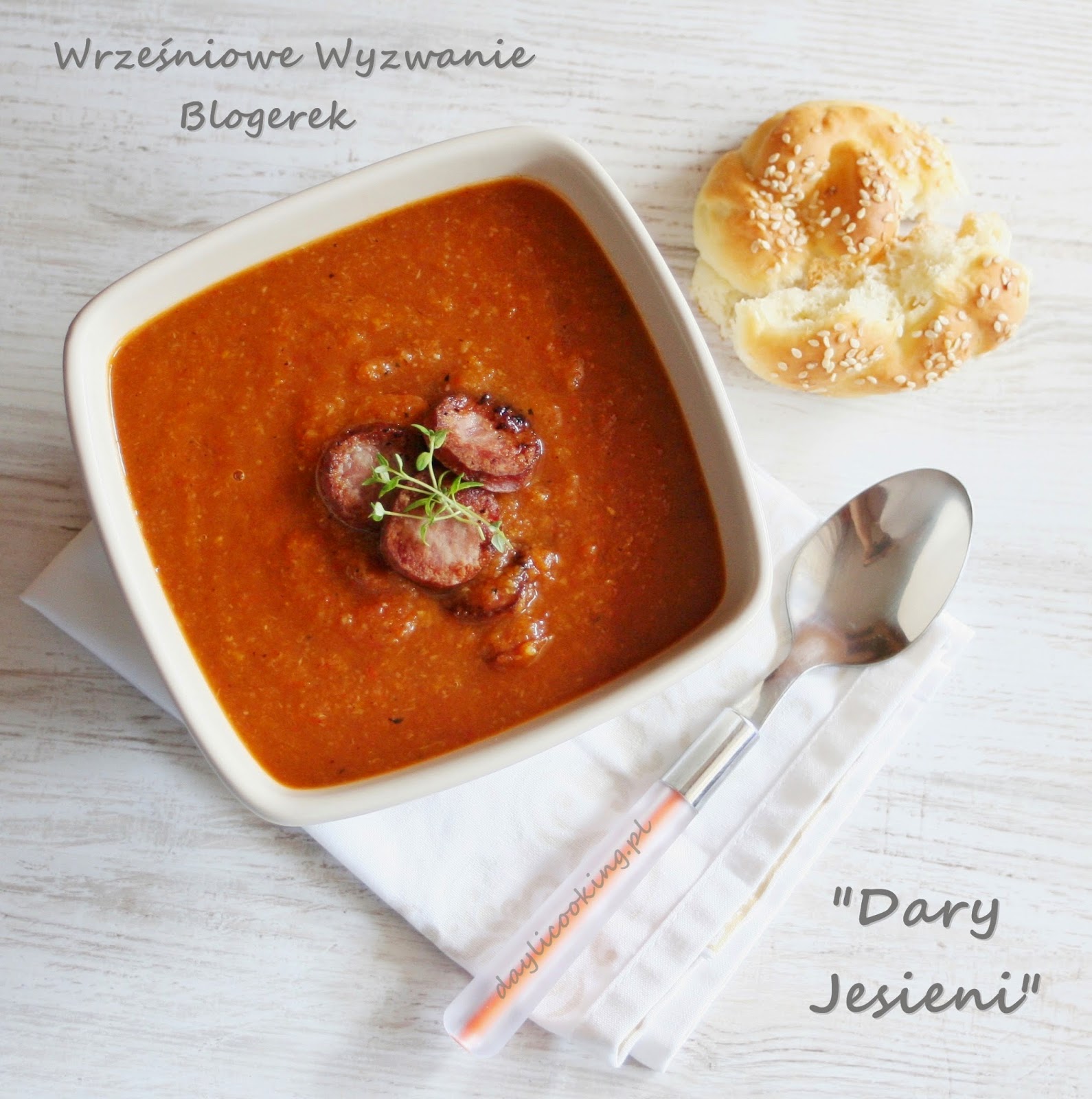 Skończyły się wakacje i powoli wracamy do codzienności. Wracają też nasze comiesięczne Wyzwania, czyli akcja polegająca na wspólnym gotowaniu grupy blogerek. W tym miesiącu tematem są “Dary Jesieni”. Temat dość rozległy, bo przecież jesień jest nie tylko kolorowa, ale też smaczna. To czas warzyw, owoców, zbierania i przechowywania plonów. W zasadzie od razu, kiedy zobaczyłam temat, ta zupa przyszła mi do głowy. Jakoś tak kojarzy mi się z jesienią, chłodniejszymi i krótszymi dniami, z liśćmi lecącymi z drzew… Może to przez kolor tej zupy?