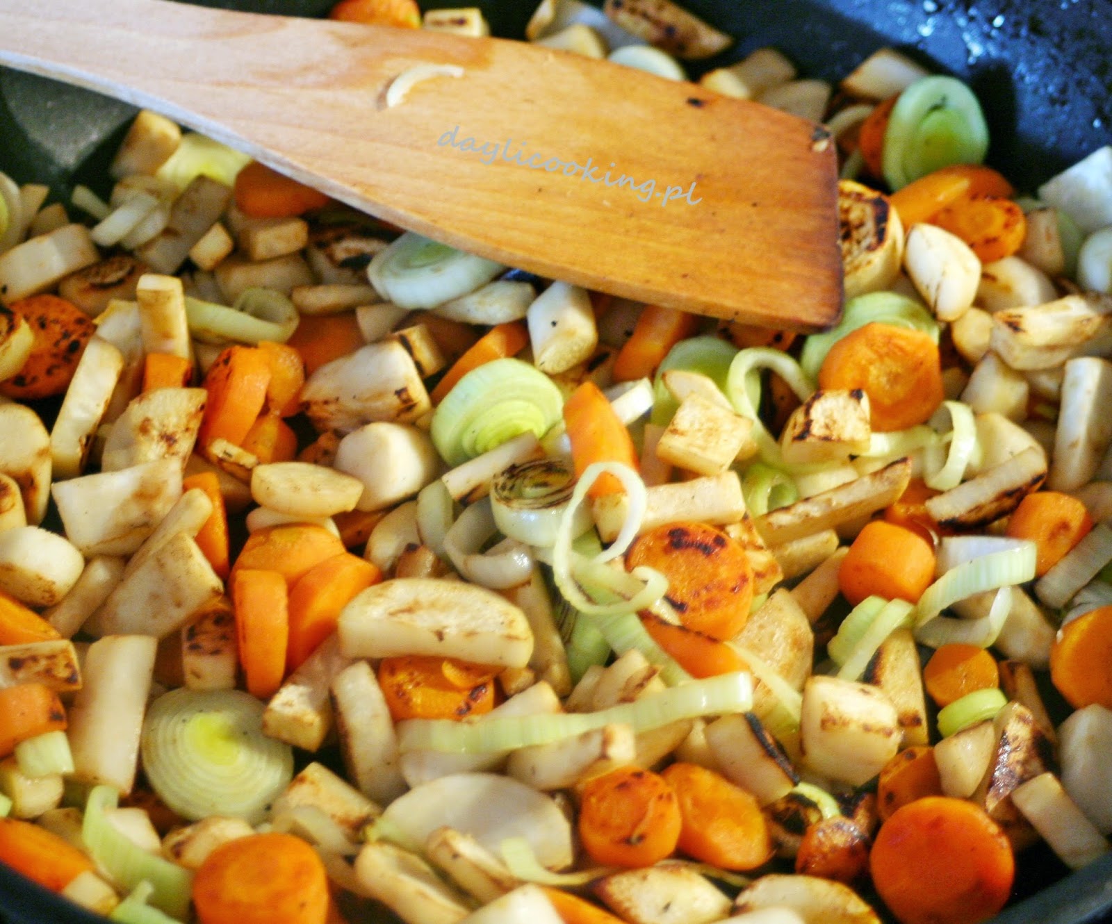 Wszystko krótko podsmażyć i przełożyć do gotujących się warzyw. Gotować razem kilka minut, następnie zmiksować blenderem lub przetrzeć przez sito. Można to zrobić lekko i uzyskać większe i mniejsze kawałki w lekko tylko przetartej zupie. Można także zmiksować ją na gładko i uzyskać bardziej aksamitną konsystencję. Doprawić do smaku.