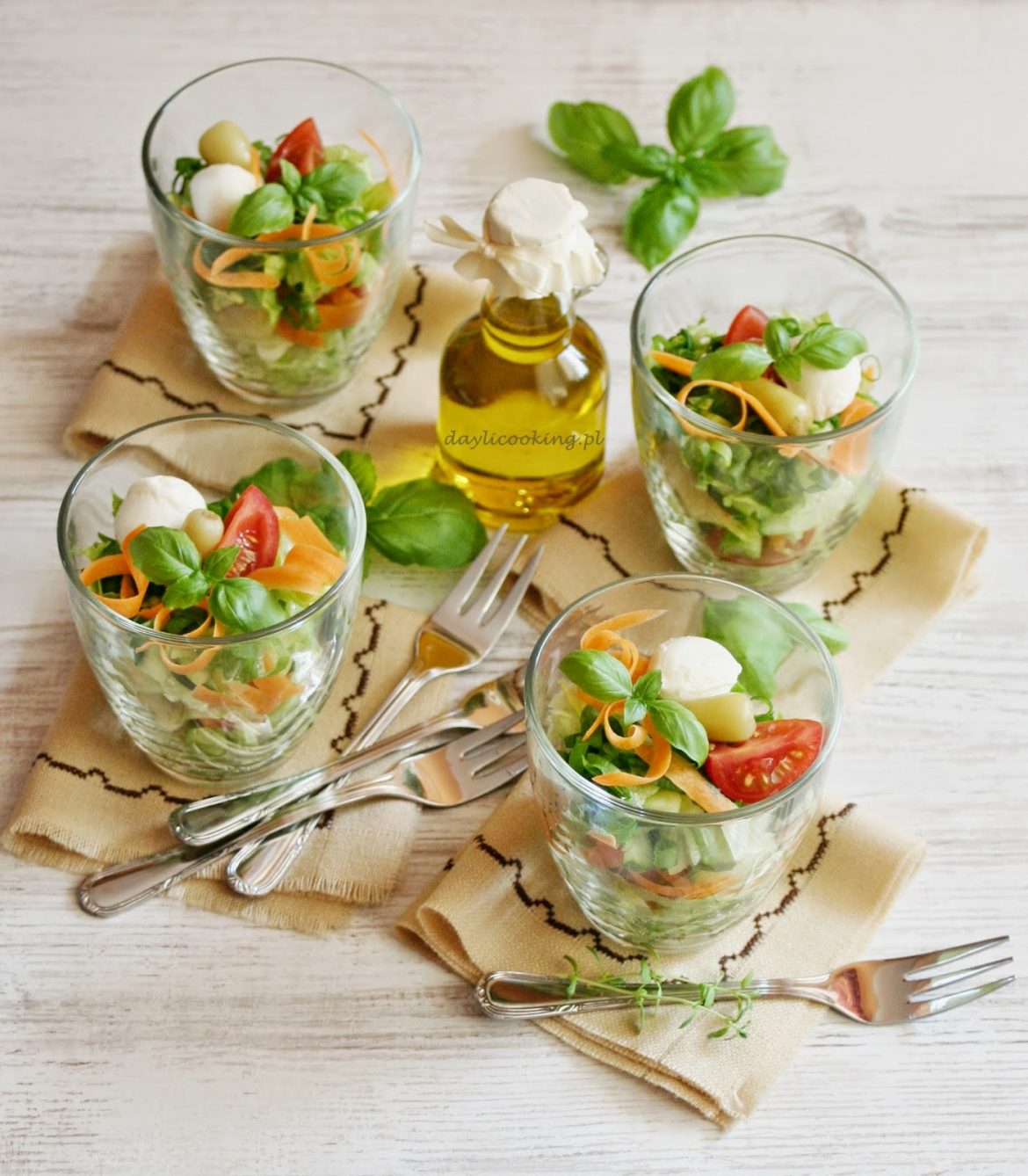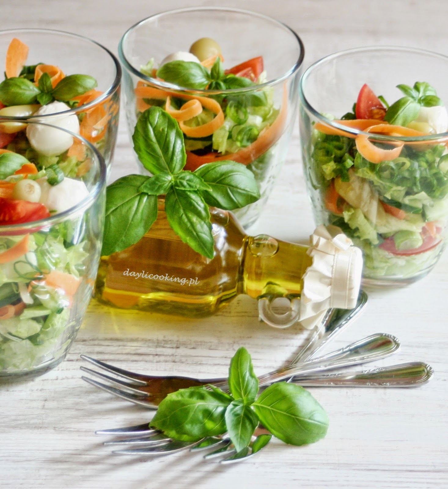Wszystkie składniki układamy w szklance, przybieramy świeżą bazylią. Podajemy osobno dowolny sos. Mogą to być sosy na bazie oliwy lub majonezu. Ja użyłam oliwy czosnkowej i paprykowej.