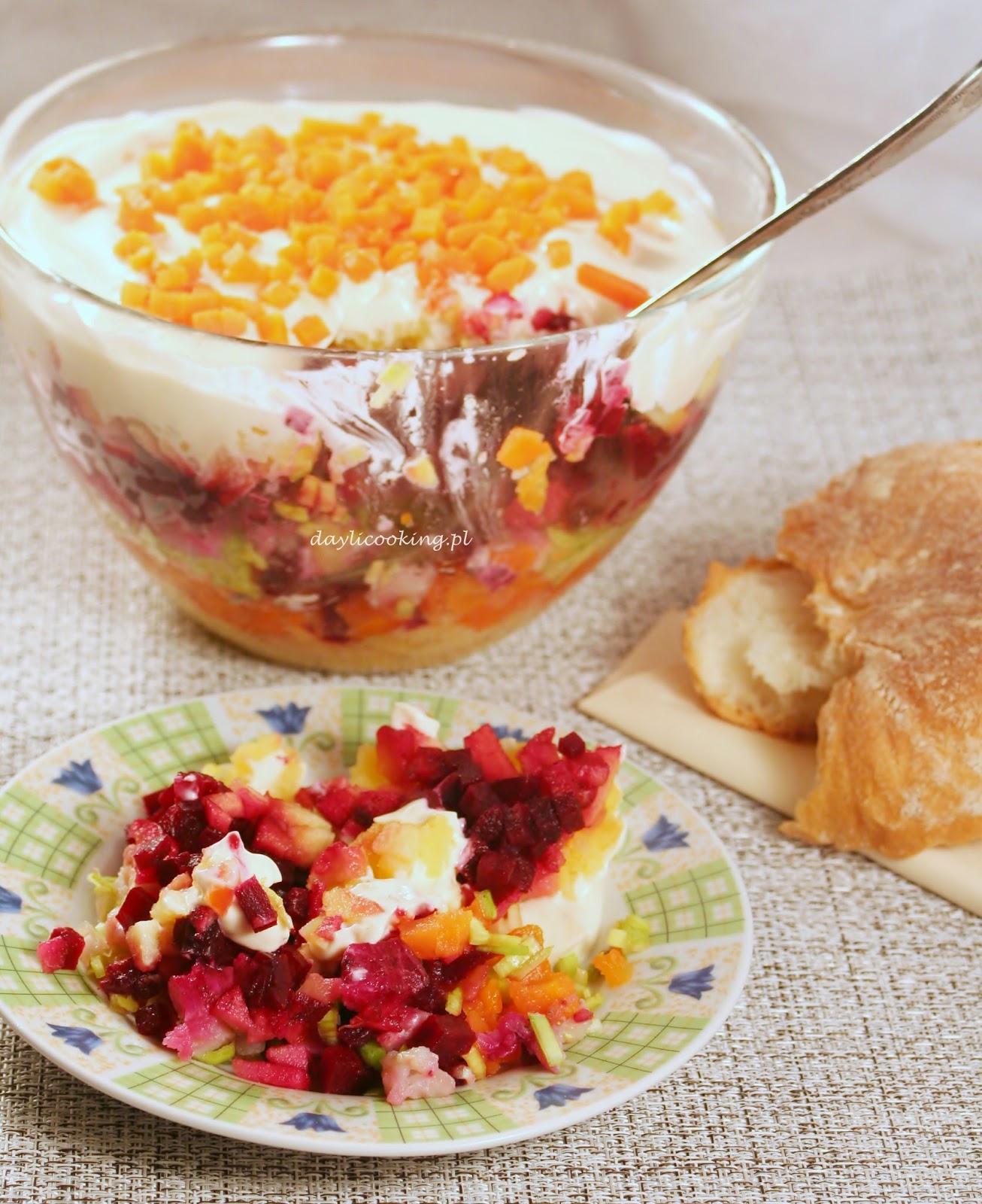 Składniki układamy dowolnie warstwami. Jako przedostatnia warstwa powinny być buraki, wtedy ich sok (o ile będą wystarczająco soczyste) powinien zabarwić punktowo warstwę majonezu.