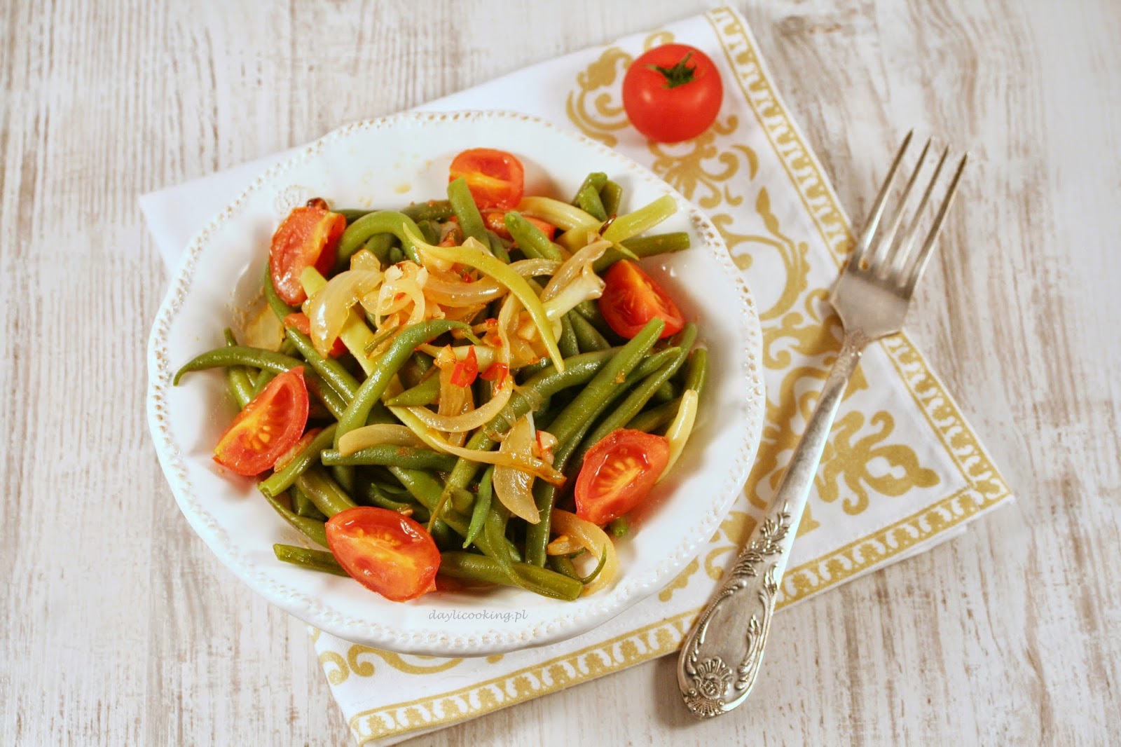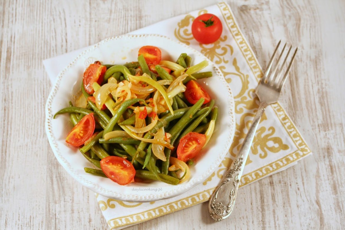 Oliwę rozgrzać na patelni, wrzucić cebulę i czosnek – przesmażyć krótko na mocnym ogniu. Dołożyć chili i pomidorki. Wszystko razem wymieszać i również krótko przesmażyć. Dorzucić fasolkę i całość doprawić solą. Danie powinno wyjść dość lekkie, nie za długo smażone. Pomidory nie powinny rozpaść się. I przede wszystkim: potrawa powinna być dość pikantna.