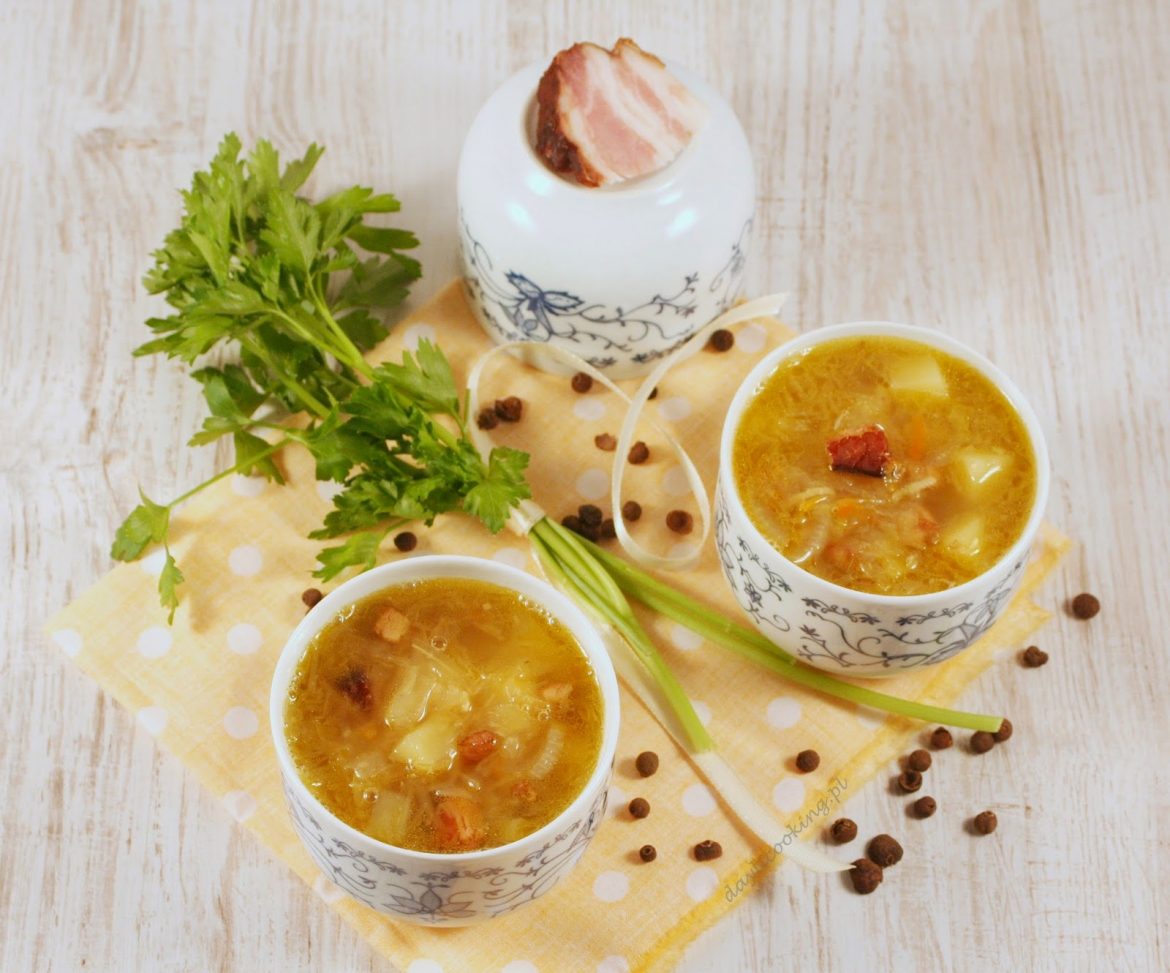 Kto z nas nie zna i nie lubi kapuśniaku? Chyba niewielu, prawda? Jest to bardzo popularna zupa, rozgrzewająca i o zdecydowanym smaku, która najczęściej pojawia się na naszych stołach zimą. Latem stawiamy na kapuśniaki z młodej kapusty, bardzo lekkie i delikatne. Zimą, kiedy wracamy do domu zmarznięci, chcemy rozgrzać się, więc sięgamy o cięższe zupy. Każda gospodyni ma swoje własne patenty na dobry kapuśniak i chyba za każdym razem wychodzi on troszkę inaczej. Przynajmniej tak jest u mnie. Tym razem mój kapuśniak powstał na żeberkach i kawałku wędzonki. Mięsa po ugotowaniu nie kroiłam i nie dodawałam do zupy, lecz razem z warzywami zmieliłam na farsz do pierogów. Można jednak dodać je do zupy, wtedy stanie się ona jeszcze bardziej sycąca.