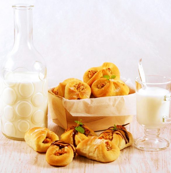 Drożdżówki odstawić na kilkanaście minut do lekkiego podrośnięcia, a następnie wstawić do piekarnika nagrzanego do temperatury 180 stopni i piec przez około 20 minut aż lekko zarumienią się.