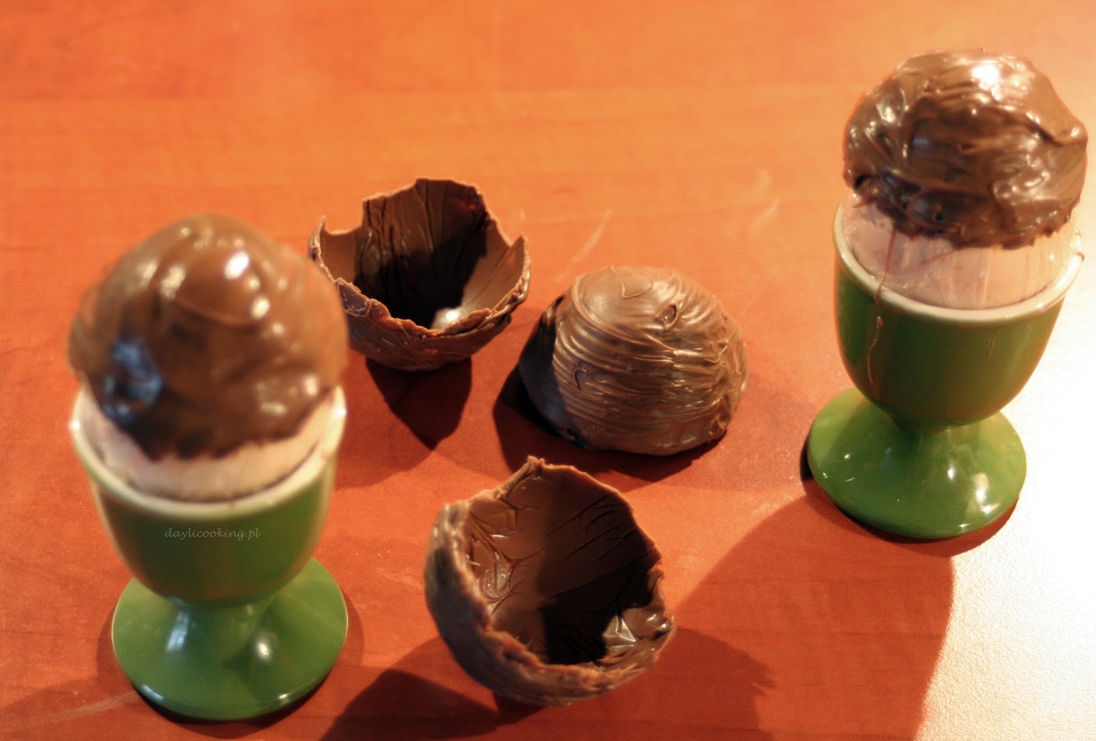 Tak przygotowane jajka ustawić w kieliszkach do jajek i pędzelkiem rozsmarować półpłynną czekoladę. Czym mniej gładko, tym efektowniej będzie wyglądać. Po nałożeniu jednej warstwy, wstawić jajka do lodówki na kilka minut. Po schłodzeniu nałożyć drugą warstwę i ewentualnie trzecią. Wstawić do lodówki przynajmniej na pół godziny. Czekolada powinna dobrze zastygnąć.