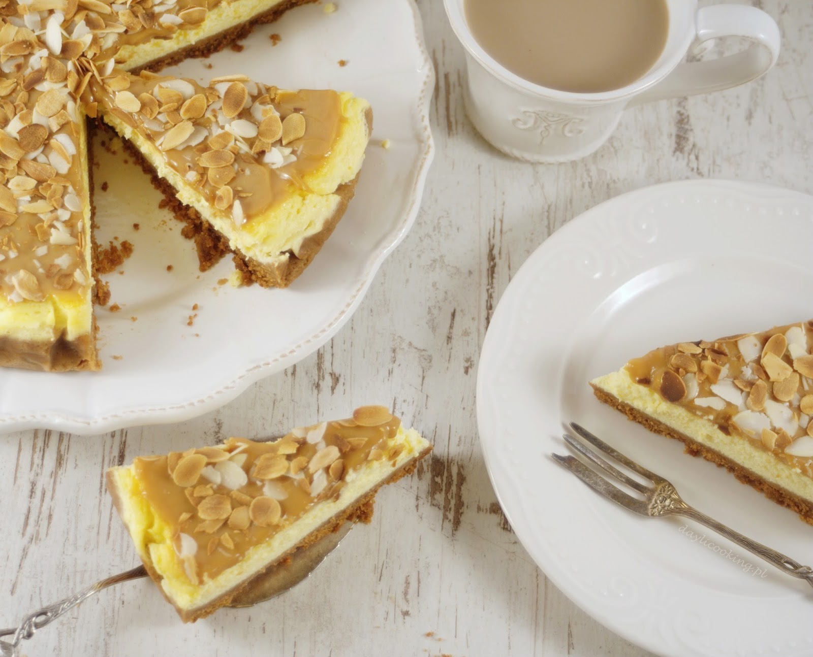 - Przed podaniem polać dowolną polewą – polecam krówkową, wystarczy tylko wyjąć ją z puszki i rozprowadzić równomiernie po powierzchni sernika. Górę można posypać uprażonymi płatkami migdałowymi.