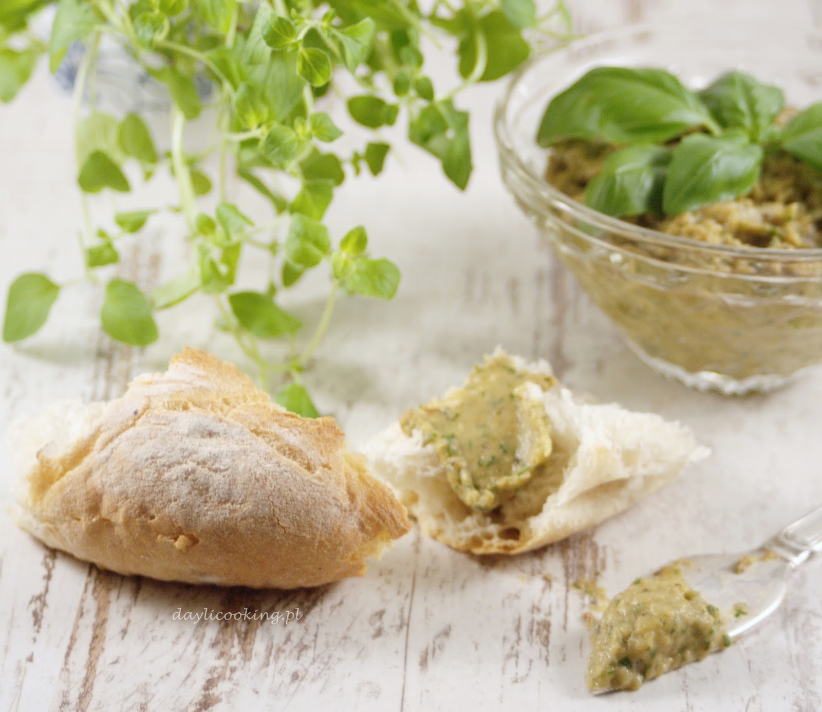 Pasta smakuje ze świeżym pieczywem, bez żadnych innych dodatków. Można ją również podać z ugotowanym al dente makaronem. Ilość ziół i przypraw można modyfikować według uznania.