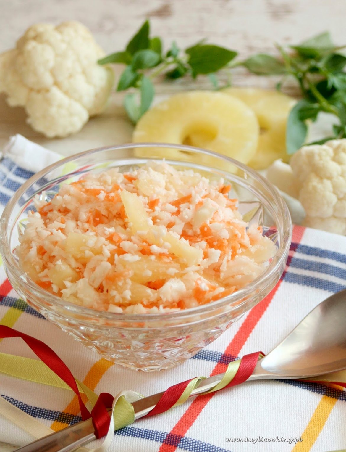 Kalafiora dokładnie wypłukać, osuszyć i zetrzeć na grubej tarce jarzynowej. Marchew obrać, opłukać i zetrzeć również na grubej tarce jarzynowej. Ananasa pokroić w niewielkie kawałki. Wszystko razem wymieszać, doprawić solą, olejem i odrobiną syropu ananasowego z puszki.