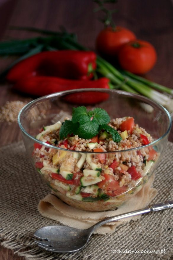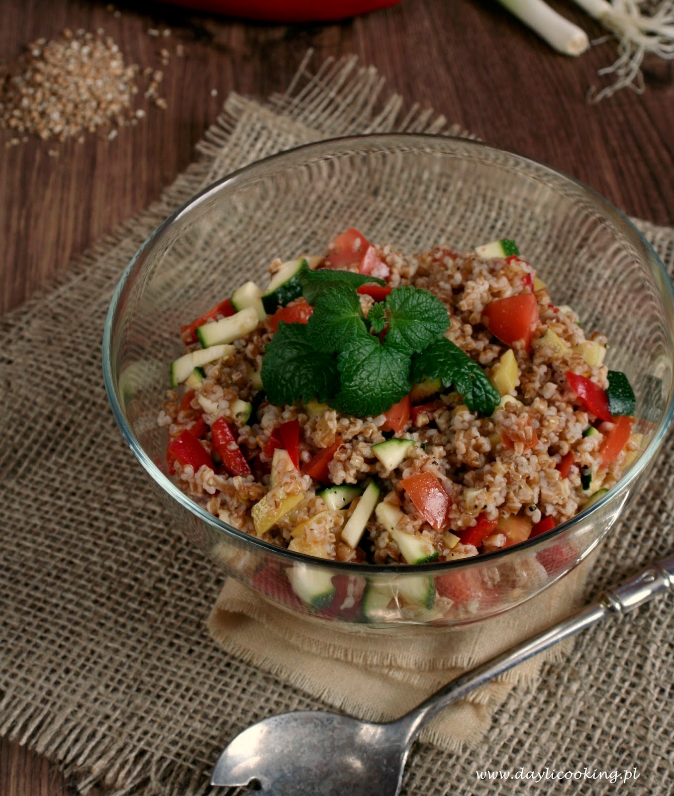 Przepis na sałatkę z kaszy orkiszowej, z pomidorami, papryką i cukinią, z dodatkiem kiszonej cytryny