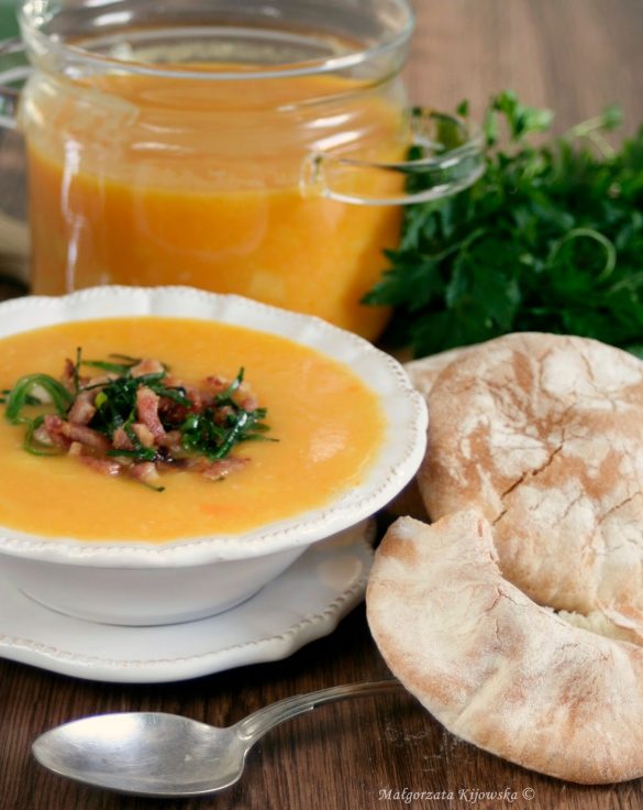 Zupę można podać na dwa sposoby: z dodatkiem słodkiej śmietanki lub z boczkiem pokrojonym w paseczki i przesmażonym z posiekanym porem. Oba warianty są pyszne 🙂 Jeśli lubicie przecierane czy też miksowane zupy, to polecam Wam krem z batatów, biały krem z kalarepy i pietruszki z dodatkiem listków szałwii, albo moją ulubioną zupę ziemniaczaną z dodatkiem łososia wędzonego. Jesień to dobra pora na takie zupy.