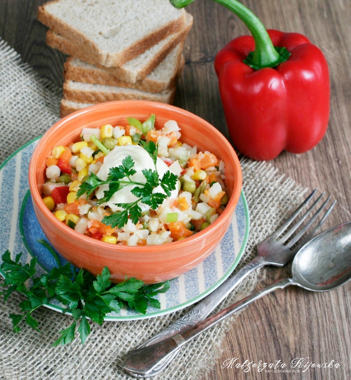 Warzywa pokroić w kostkę. Pora dokładnie wypłukać i posiekać. Paprykę opłukać, wykroić gniazdo nasienne i pokroić w kostkę. Kukurydzę i groszek odsączyć na sicie, lekko przepłukać. Natkę pietruszki posiekać. Wszystko razem delikatnie wymieszać, dodać majonez i przyprawić solą i pieprzem.