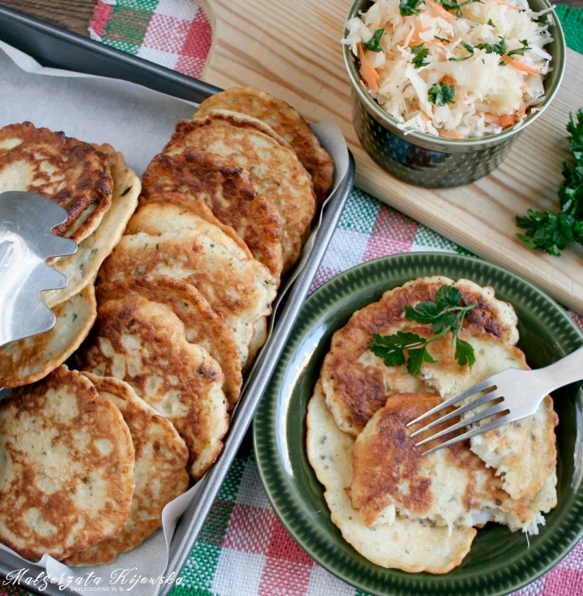 Do większej miski wlać mleko, wsypać sól (ok.1/2 – 1/3 łyżeczki), dodać pieprz i ulubione przyprawy oraz 1 szklankę mąki. Wszystko razem wymieszać tak, aby nie było grudek. Gdyby ciasto wydawało się zbyt luźne, można dosypać jeszcze mąkę. Jajka wbić do mleka z mąką i całość roztrzepać na gładkie ciasto. Odstawić na kilka minut. W tym czasie kapustę kiszoną odcisnąć z nadmiaru soku. Najłatwiej robić to biorąc garść kapusty i ściskając dłońmi wycisnąć sok. Odciśniętą z soku kapustę pokroić drobno i dodać do ciasta naleśnikowego. Wymieszać łyżką. Na patelni rozgrzać olej lub dowolny tłuszcz do smażenia. Nakładać łyżką porcje ciasta, lekko rozprowadzając je, aby nie było zbyt grube – smażyć dokładnie tak samo jak placki ziemniaczane na średnim ogniu. Podawać z naturalnym jogurtem, śmietaną, sosem mięsnym, z dodatkiem surówek – co nam tylko do głowy przyjdzie.