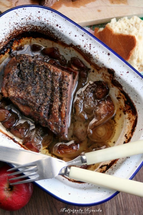 Tak upieczone mięso jest miękkie i soczyste. Nabiera pięknego aromatu od cebuli, jabłek i majeranku.