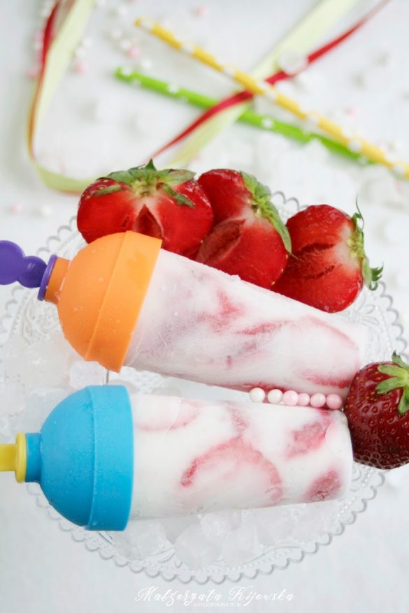 Truskawki ułożyć w pojemniczkach do lodów, zalać jogurtem. Zamrozić w zamrażarce.