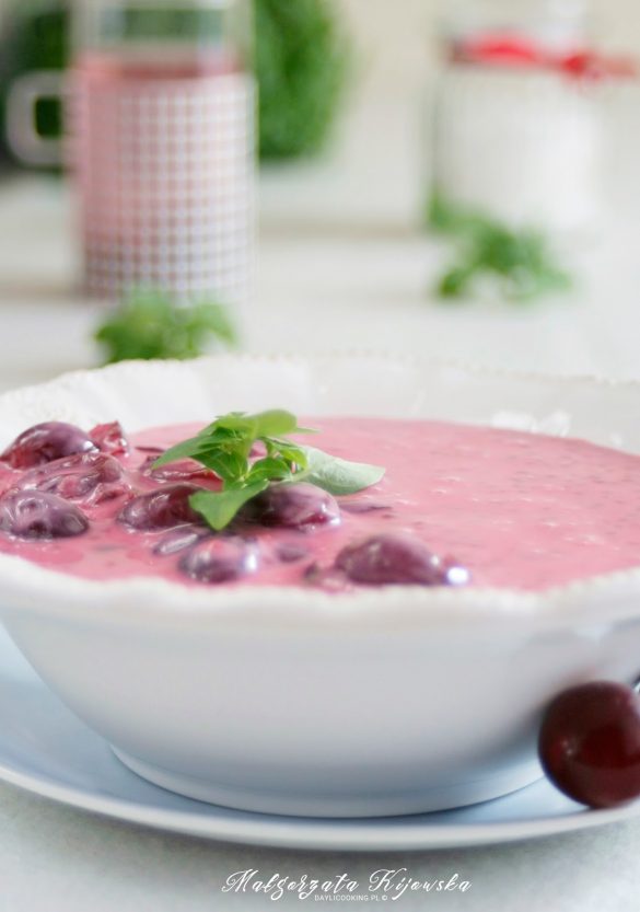 Sezon na wiśnie w pełni, więc wykorzystuję je na wszelkie możliwe sposoby. Dzisiaj przyszedł czas na pyszny wiśniowy chłodnik. Zupa idealna podczas letnich upałów, zwłaszcza dla łasuchów. Aby ją wzbogacić o cenne wartości odżywcze dodałam do niej nasiona chia, które lekko ją zagęściły. Szukając w sklepie jogurtu do tej zupy, zwróćcie uwagę, aby był on naprawdę naturalny, czyli bez dodatku emulgatorów czy mleka w proszku.