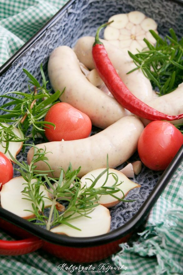 Kiszkę ziemniaczaną przesmarować olejem. Najwygodniej nalać trochę oleju na dłonie i nimi rozsmarować go. Podobnie cebulę, czosnek, pomidorki i papryczkę. Wszystkie produkty ułożyć w naczyniu do zapiekania. Na wierzch dołożyć gałązki rozmarynu.