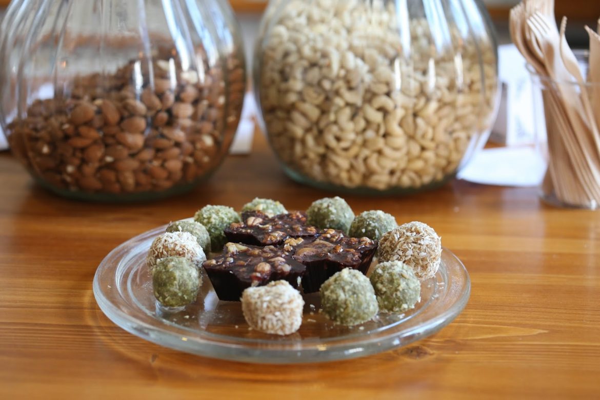Pewnie nie powinnam się przyznawać, ale zaszalałyśmy i spróbowałyśmy kilku pysznych deserów. Zaczęłyśmy od wegańskiego sernika z…orzechów nerkowca. Sernik był delikatnie zielony dzięki matcha, czyli sproszkowanej zielonej herbacie. Smak naprawdę cudowny! Porównać go można do smaku tradycyjnego sernika z dobrej jakości twarogu. Gdybym nie wiedziała z czego jest zrobiony, to nie wpadłabym na to, że to orzech.
