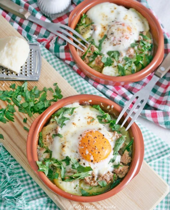 - Wstawić do piekarnika nagrzanego do temperatury 180 stopni i zapiekać około 10 minut do odpowiedniego ścięcia jajka – jeśli wolimy bardziej ścięte, wtedy zapiekać dłużej.