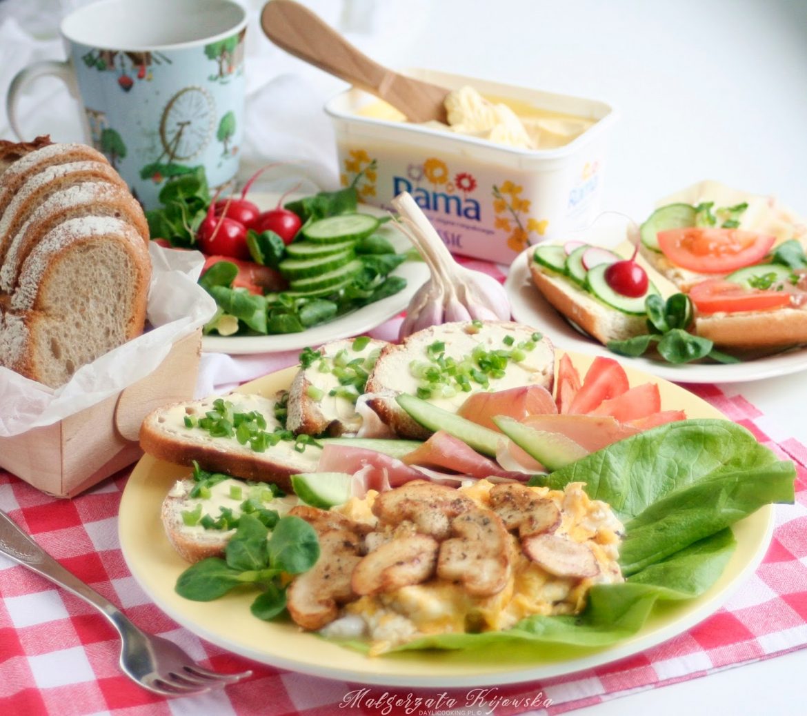 Pieczarki oczyścić, pokroić w plasterki, obsmażyć na odrobinie oleju rzepakowego. Jajka wbić do miseczki, dodać sól i pieprz do smaku, lekko rozbić. Wlać na patelnię do pieczarek i mieszając usmażyć do odpowiedniego stopnia ścięcia. Podawać z pieczywem posmarowanym Ramą Classic i obsypanym posiekanym szczypiorkiem.
