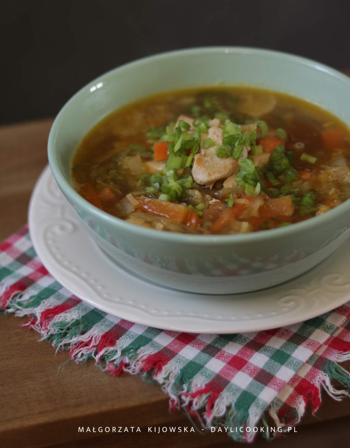 W garnku rozgrzać olej. Na większym ogniu podsmażyć mięso na złoty kolor. Dodać por, wymieszać i smażyć przez około pół minuty. Dodać marchewkę i opcjonalnie bardzo drobno posiekaną papryczkę chilli, wlać wodę w ilości takiej, aby zakryła wszystkie składniki. Na niewielkim ogniu gotować przez ok. 3 minuty. Na końcu dodać kapustę i dolać ewentualnie wody. Przyprawić sosem sojowym, dodać czosnek i imbir. Gotować do wymaganej miękkości. Na końcu wlać sok z cytryny. Na talerzu, bezpośrednio przed podaniem, posypać posiekanym szczypiorkiem.