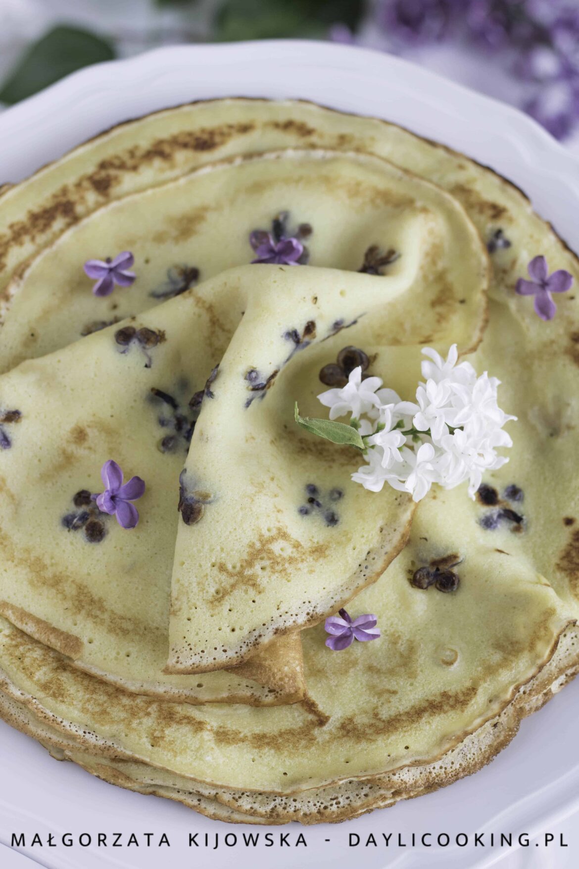 Naleśniki z bzem lilakiem zrobiłam kilka dni temu na podwieczorek na ciepło. Bez już niebawem przekwitnie, a ja do tych naleśników przymierzałam się już od ubiegłego roku. Mimo, że kwiatki lilaka nie mają jakiegoś szczególnego wpływu na smak naleśników, to jednak dodają fajnego aromatu. Czym ich więcej, tym piękniej pachnie, możesz więc zwiększyć ich ilość w cieście. Ja moje naleśniki podałam częściowo z twarożkiem waniliowym, a częściowo lekko oprószone cukrem pudrem. Najlepiej smakują jeszcze ciepłe, więc smaż i zajadaj od razu 🙂 Jeśli nie masz jednak pod ręką bzu lilaka, to możesz wykorzystać dowolne jadalne kwiatki, na przykład czarnego bzu, nasturcji, fiołka, płatków goździków, nagietka i tak dalej …