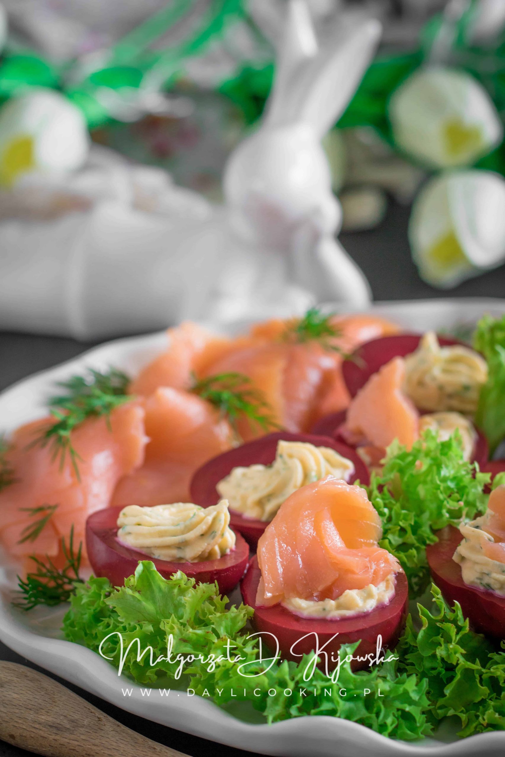 Jajka marynowane w zakwasie z buraków, faszerowane i z dodatkiem wędzonego łososia to pyszne i efektowne danie nie tylko na wielkanocny stół.